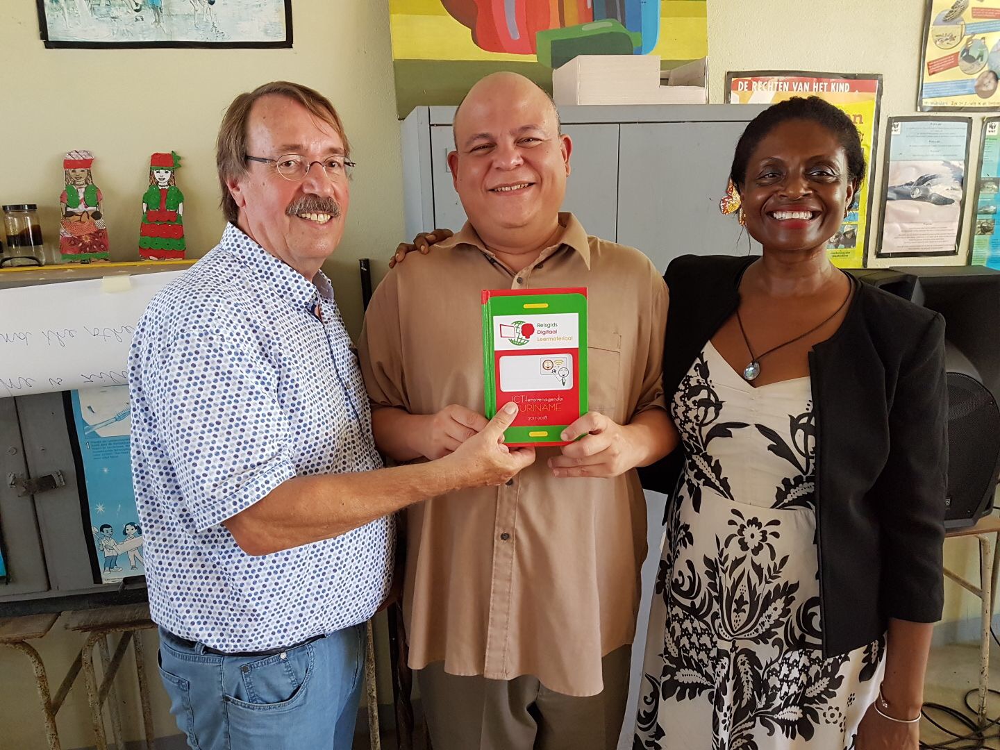 Eerste exemplaar ICT-lerarenagenda 2017 (oplage 10.000 ex) aan toenmalige Surinaamse minister van Onderwijs Robert Peneux (met Miriam Weekers)