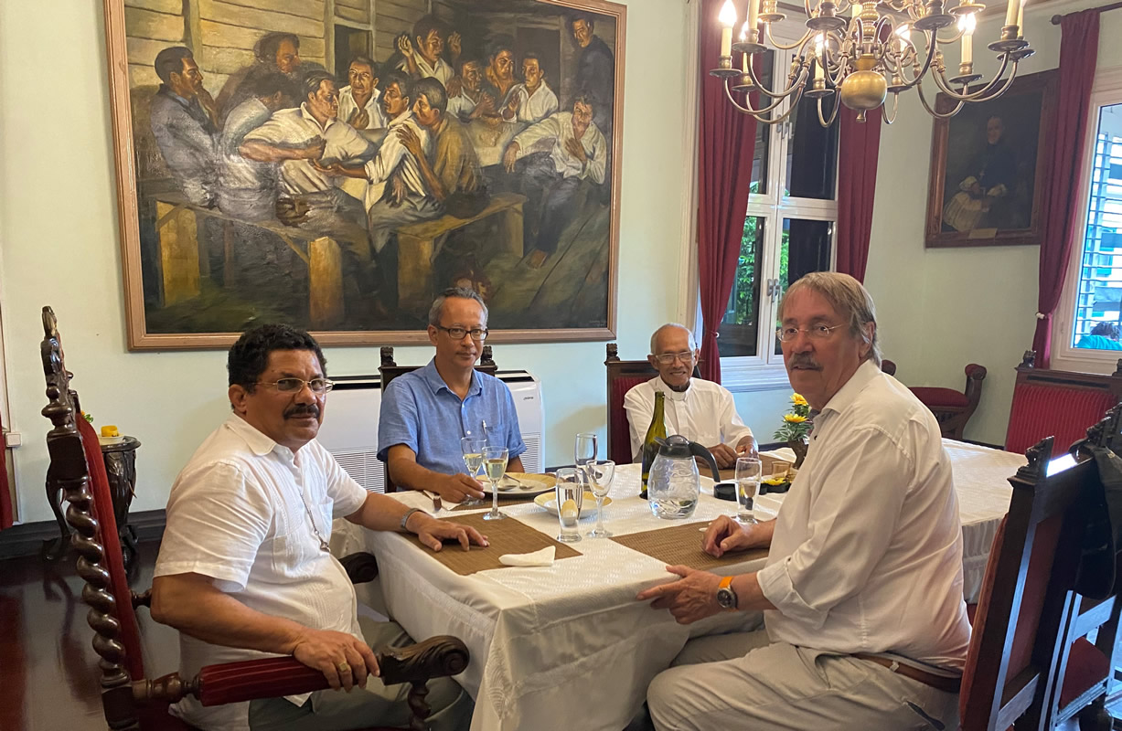 Louis Hilgers in de rol van persoonlijk onderwijsadviseur op bezoek bij Mgr. Karel Choennie, bisschop van Paramaribo/ Suriname en zijn vicaris Paul Tjon Kiem Sang.