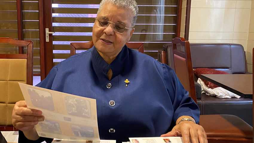 Toenmalig Surinaamse minister van Onderwijs Marie Levens kijkt goedkeurend naar het beeldmateriaal van het project / initiatief Kunstkwartet Suriname.